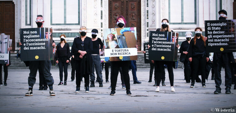 Si è tenuto il 15 maggio 2021, a Firenze, il secondo flash mob, organizzato da Progetto Vivere Vegan, contro la decisione del Consiglio di Stato di permettere alle Università di Parma e di Torino di portare avanti la sperimentazione sui macachi nel progetto Light-Up.