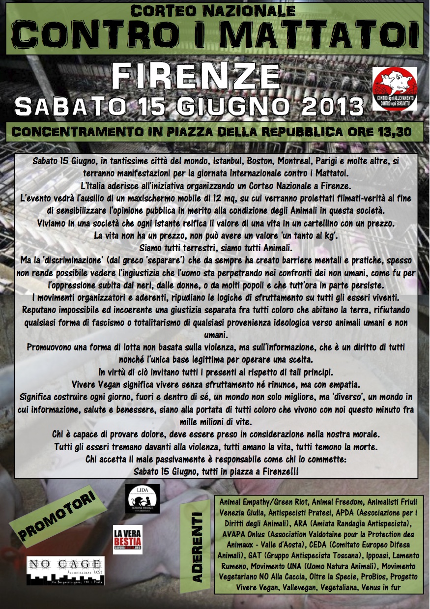 L’Italia aderisce all’iniziativa organizzando un Corteo Nazionale con l’ausilio di un maxi-schermo mobile di 12 mq, su cui verranno proiettati filmati al fine di sensibilizzare l’opinione pubblica in merito alla condizione degli Animali in questa società.