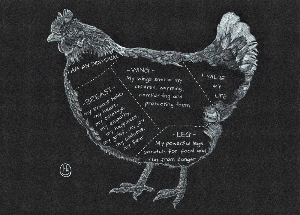 Sullo stesso tema troviamo altre opere dell’artista, in particolare la serie “Cuts” (Tagli). Con la matita Helen rappresenta una gallina (immagine allegata alla fine del paragrafo), un maiale e un agnello, mettendo in primo piano le parti di questi animali che vengono generalmente vendute ai consumatori.