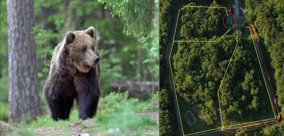 Foto di copertina: il recinto Casteller visto dall’alto. Evidenziata in rosso è la zona di detensione degli orsi.