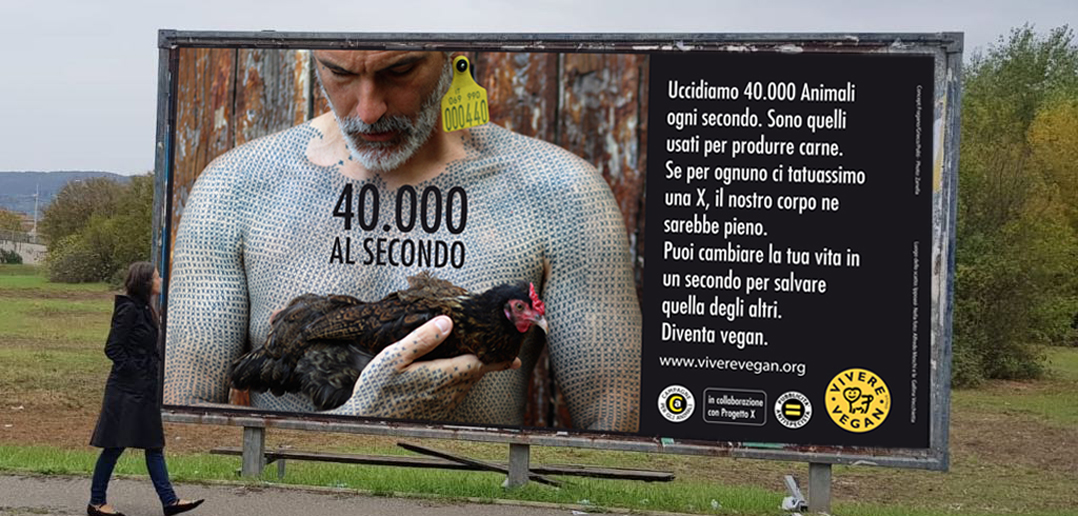 In questo mese di giugno, con il progetto Comunichiamolo, Progetto Vivere Vegan affiggerà mega manifesti con un messaggio animalista in molte città italiane. Sarà la campagna “40.000 al secondo” – ideata da Campagne per gli Animali – a veicolare questo nostro messaggio in favore degli Animali.
