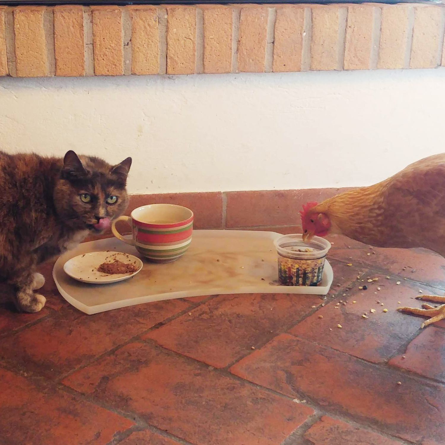 Come dicevo con i gatti ha un rapporto alla pari, e tra le due specie ci sono molte più somiglianze comportamentali di quelle che possiamo immaginare: sonnecchiare, curare le penne/pelo in modo maniacale, cercare posti caldi che ricordino una tana, giocare con piccoli oggetti trovati in giro e persino inseguire le mosche entrate in casa sono hobby che condividono. Spesso stanno insieme sul divano d’inverno o all’ombra di un cespuglio in estate. Mangiano in ciotole vicine (non le stesse cose chiaramente) e condividono la ciotola dell’acqua vicino a cui spesso ci sono delle scene tipo mezzogiorno di fuoco, perché Paramita tiene moltissimo all’ordine di bevuta e se anche uno dei gatti vuole bere in quel momento li trovi immobili a fissarsi e lanciarsi occhiatacce finché uno dei due (di solito il gatto) non decide di andarsene e l’altro beve.