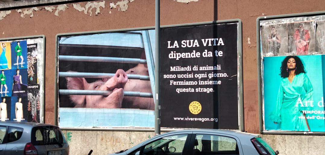 In tre postazioni della città di Milano è visibile il grande manifesto antispecista che riporta questa frase: “La sua vita dipende da te. Miliardi di animali sono uccisi ogni giorno. Fermiamo insieme questa strage.” Nel manifesto si vede l’immagine di un maiale in primo piano, mentre morde la sbarra che lo tiene prigioniero, su di un camion, che lo porta verso il macello.
