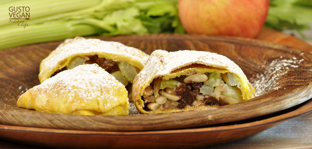 Uno strudel singolare realizzato con sedano e mele, ma senza nessun ingrediente animale. Una ricetta semplice e veloce da realizzare.