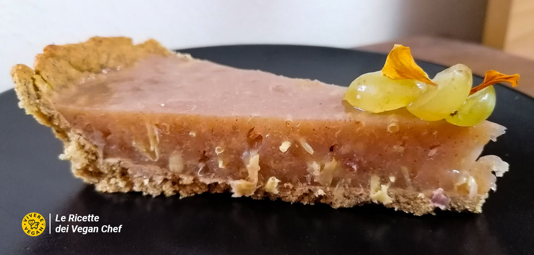Accendiamo il forno. Prendiamo la palla di frolla e stendiamola sopra un foglio di carta da forno a mattarello nello spessore inferiore a 3 mm, trasferiamo nella teglia, diamo forma ai bordi, bucherelliamo con i rebbi della forchetta la base e mettiamo in forno a 170° per 12-15 minuti. Sforniamo e mentre lasciamo raffreddare un po’, rovesciamo in una pentolina la nostra uva, aggiungiamo l’agar agar e mescoliamo bene portando a bollore. Spegniamo.