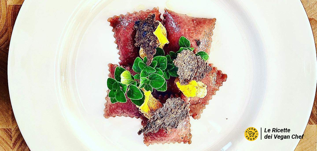 La domanda classica di un po’ tutti i giorni era “Che cosa mi cucino oggi?!”, la risposta fu immediata, “Qualcosa di nuovo che non ho mai cucinato personalmente prima d’ora”. Da bambino non facevo i salti di gioia per la pasta ripiena, ma crescendo ho riscoperto le gioie che tali prodotti possono regalare. Non avendoli mai fatti prima nella versione vegetale, decisi di cimentarmi nella preparazione dei ravioli dandogli un tocco in più grazie all’utilizzo dell’estratto di barbabietola, ingrediente che spesso viene sottovalutato nelle cucine degli italiani, e autoproducendo la “ricotta” di soia che è estremamente facile realizzarla.