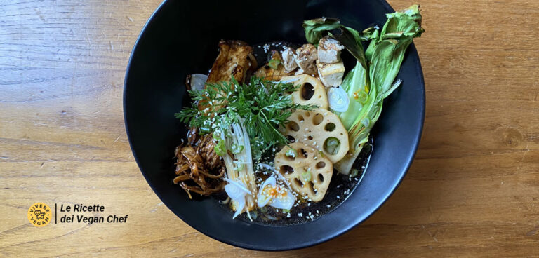 Tritare finemente in ginger, l’aglio e il cipollotto dal quale mantenere la parte verde tagliata fine e messa in acqua e ghiaccio da utilizzare per la guarnizione. Imbiondire i 3 ingredienti tritati e poi aggiungere il tofu [tagliato a cubetti di circa 2cm e marinato possibilmente 24h prima con salsa di soia, aceto di riso e olio], 3-4 foglie esterne del Pak-choy e il fungo King Oyster. Cuocere per altri 2- 3 minuti circa, poi aggiungere la salsa di soia, la radice di loto e l’acqua.