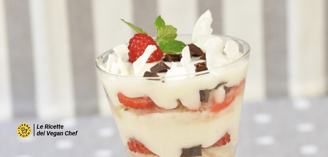 Una versione bianca della zuppa inglese con pan di Spagna e crema al cocco e la leggera acidità dei lamponi.