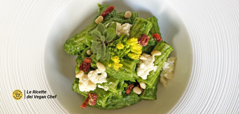 Siamo abituati a mangiare piatti di pasta con il classico pesto di basilico che senza dubbio rimane tra i miei preferiti, però ricordiamoci che possiamo sfruttare anche altri ingredienti, come in questo caso le cime di rapa. Ho utilizzato dei tortiglioni di germe di grano duro, ovvero il cuore del chicco di grano; il tutto è stato completato con una “ricotta” vegetale molto leggera, pomodorini secchi e pinoli tostati.